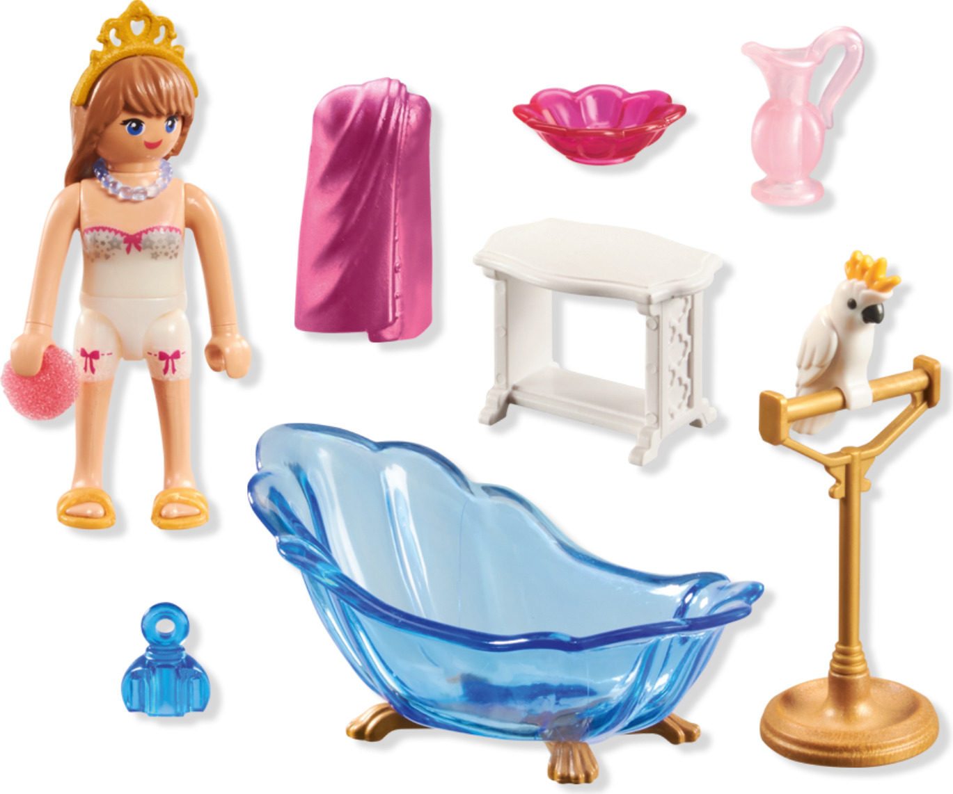 Delight in a serene royal bath as the princess luxuriates in her elegant bathtub filled with real water. Every detail of the PLAYMOBIL Royal Bathtub set, from the sparkling water to the soft towel, creates an atmosphere of refined relaxation. The graceful cockatoo adds charm, while the detailed accessories enhance the experience and encourage creative play.